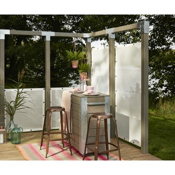 Succes verzekerd met het Cubic pergola systeem. Maak eenvoudig een constructie door gebruik te maken van houten palen en de bijbehorende Cubic verbindingselementen. Kies vervolgens één of meerdere Cubic schermen om het geheel stijlvol mee te voltooien. Met dit handige windscherm zit je niet alleen comfortabel uit de wind, maar heb je ook enige bescherming tegen de zon. Dit windscherm heeft een afmeting van 90 bij 180 cm en wordt geleverd in de kleur wit. Het geheel wordt geleverd inclusief 4 stuks bevestigingsmateriaal.