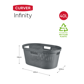 De Curver Infinity Dots wasmand 40L in de kleur antraciet is gemaakt van volledig gerecycled materiaal. Dankzij de open structuur kan het wasgoed voldoende luchten. De Infinity Dots wasmand is voorzien van comfortabele handvaten en is gemakkelijk schoon te maken. De Dots wasmand 40L is ook verkrijgbaar in de kleur wit en groen.