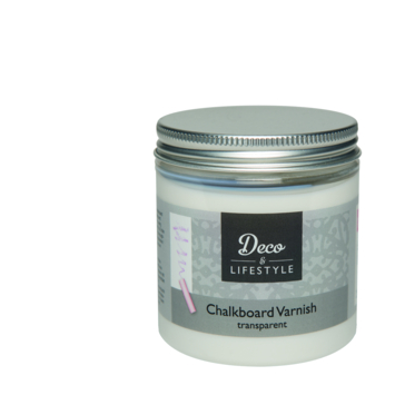 Een transparante krijtbord vernis op waterbasis die van elk oppervlak een krijtbord maakt. Na droging van de vernis is deze beschrijfbaar met krijt en kan worden afgenomen met water. Voor het optimalte resultaat brengt u 2 à 3 lagen aan (tussentijds laten drogen). De krijtbord vernis is uitstekend te gebruiken op voorwerpen die met Deco & Lifestyle krijtverf zijn behandeld. Voor net dat beetje extra bescherming tegen krassen en stoten. Inhoudsmaat 230 milliliter.