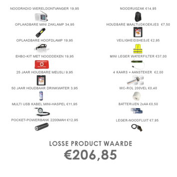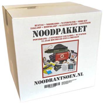 Denk vooruit met het in huis halen van een noodpakket - Voorbereid op elke situatie! Een onverwachte ramp kan op elk moment plaatsvinden. Denk aan natuurrampen zoals overstromingen of aardbevingen, technische storingen zoals stroomuitval of watertekort, of zelfs situaties zoals een virusuitbraak of een kernincident. Dit noodpakket biedt alles wat je nodig hebt om de eerste dag zelfstandig door te komen, zonder hulp van buitenaf. Dit noodpakket bevat: - Een radio om op de hoogte te blijven via de rampenzender. - Een zaklamp en powerbank om je apparaten op te laden. - Een uitgebreide EHBO-kit voor noodsituaties. - 1 dag aan houdbaar voedsel en water, met een noodrantsoen dat tot 25 jaar meegaat. - Een waterfilter om vervuild water te kunnen reinigen. Dit noodpakket is ideaal voor thuis én onderweg, en biedt een complete basis voor acute situaties. Wees voorbereid. Denk vooruit.