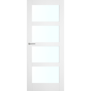 De deur Floor blank glas wit stomp 83 x 211,5 cm is onderdeel van de Lundia serie Eerlijk en Eigentijds. Deze binnendeur is opgebouwd uit een massieve kern en voorzien van vier voorgemonteerde glasvlakken. Het blanke glas laat veel licht door waardoor kamers met elkaar in verbinding staan zonder hun eigen karakter te verliezen. Het witte kader rondom de ruiten benadrukt de eenvoud en geeft de deur een rustige uitstraling die goed past bij een eigentijdse inrichting.