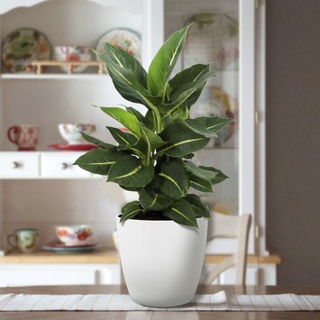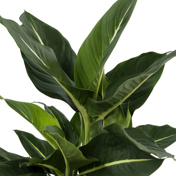 Deze Dieffenbachie "Green Magic" herken je direct aan zijn diepgroene bladen met witte nerf. De bladeren springen er uit door hun formaat en aanwezigheid. Met een hoogte van ongeveer 80 cm, en een potmaat van 24 cm in diameter, is de Dieffenbachie een volwaardige kamerplant. De plant heeft een luchtzuiverende werken, maar dat komt wel met een keerzijde. De plant gebruikt die stoffen namelijk en is daardoor giftig. Kies de positie van deze plant dus zorgvuldig wanneer je kinderen en/of huisdieren hebt.