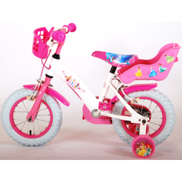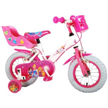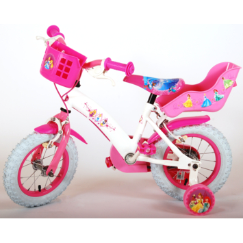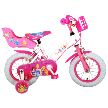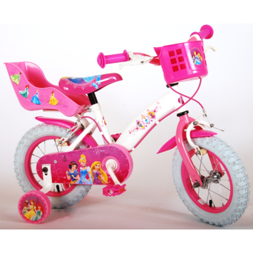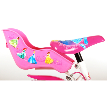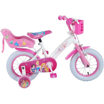 Disney Princess 12 inch meisjesfiets. Ieder meisje heeft wel eens een van de films van Walt Disney gezien waarin knappe prinsessen zoals Belle, Doornroosje of Assepoester de show stelen. Bijna alle meisjes dromen ervan om later, als zij groot zijn, een échte prinses te zijn. Voor iedere jonge prinses in spé heeft Volare een prachtige 12 inch meisjesfiets ontworpen! De fiets is compleet met de mooie poppenzit en het handige fietsmandje, zodat de kleine prinses haar spulletjes overal mee naar toe kan nemen. Verder is deze fiets voorzien van een gesloten kettingkast, ter bescherming van de kleine vingertjes, kunststof spatborden en afneembare zijwieltjes om snel te kunnen leren fietsen. Op deze fiets wil ieder meisje wel naar school of naar haar vriendinnetjes fietsen! Disney Official Licensed Product.
