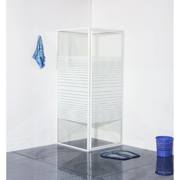 De Riga douchecabine draaideur met zijwand, 90x90 cm voorzien van witte aluminium profielen en 4 mm veiligheidsglas met een horizontaal streepdecor. De draaideur scharniert aan de muur wat zorg voor een ruime instap. De douchecabine is zowel links- als rechtsdraaiend te plaatsen op een douchebak of op de vloer. Dankzij de ruime afstelmogelijkheid van 87,5 tot 91 cm is de de cabine altijd waterpas te plaatsen. De deuren zullen tussen altijd netjes sluiten, zelfs wanneer de muren iets scheef zijn. Met de meegeleverde montage instructie & bevestigingsmaterialen kun je de douchecabine zelf installeren.