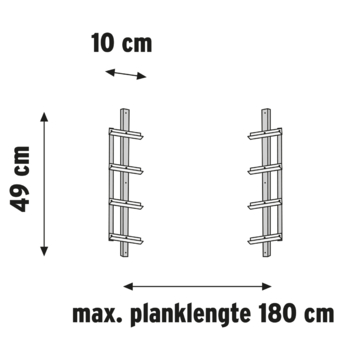 - Kan zowel horizontaal als verticaal gemonteerd worden met planken van max. 180 cm lang
