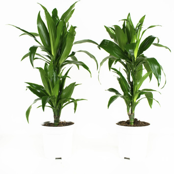 Al jarenlang is deze Dracaena een populaire kamerplant in Nederland. Veel bladeren met veel groen op een stevige stam. De Dracaena Janet Craig heeft lange bladeren met een puntvormig uiteinde. Deze Dracaena heeft een stoere bijnaam gekregen. Hij wordt namelijk ook wel 'Drakenbloed' genoemd vanwege het rode hars die uit de stam komt wanneer er een snee in komt. De plant is ongeveer 65 cm hoog en heeft een potmaat met een diameter van 17 cm. De plant wordt per 2 stuks aangeboden en heeft een luchtzuiverende werking. Daar tegenover staat wel dat deze plant lichtelijk giftig is. Houdt dus rekening met de positie van de plant als je kinderen of huisdieren hebt.