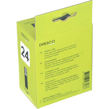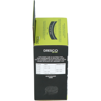 Dresco binnenband met een hoge weerstand tegen lekrijden. Geschikt voor onder andere de bandenmaat 24 x 1 3/8 of ETRTO maat 37-540 en uitgevoerd met een 40mm hoog Schrader (Auto) ventiel. Door de hoge elasticiteit is de Dresco binnenband geschikt om een grote verscheidenheid aan bandmaten af te dekken. Deze binnenband is geschikt voor buitenbanden met inch maat: 24 x 1 3/8 24 x 1.50 24 x 1.75 24 x 1.90 24 x 2.00 24 x 2.10 24 x 2.125 Deze binnenband is geschikt voor buitenbanden met ETRTO maat: 37-540 37-541 40-507 47-507 47-507 50-507 54-507 57-507 In het productieproces is er veel aandacht besteed aan de samenstelling van de hoogwaardige bestandsdelen die voor het fabriceren van de band worden gebruikt. Hierdoor heeft u een kwalitatief betrouwbare binnenband die de band langer op de gewenste spanning houdt.