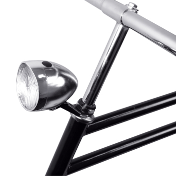 grote drukknop. Het retro voorlicht werkt op 2 meegeleverde AA/LR6 batterijen.