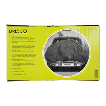 De Dresco fietshoes geeft optimale bescherming tegen regen, stof, vuil, ijs, sneeuw, hitte en tegen het dof worden van de lak. De hoes is geschikt voor het gebruik op een fietsendrager maar kan ook gebruikt worden voor het stallen van de fiets. De fietshoes heeft een elastische zoom voor een perfecte pasvorm en de bevestigingshaken zorgen dat de fietshoes ook eenvoudig is aan te brengen en vast te zetten. De fietshoes is geschikt voor één fiets en is gemaakt van stevig polyester. De afmeting van de enkele fietshoes is 200 x 72 x 98 cm.