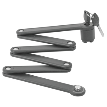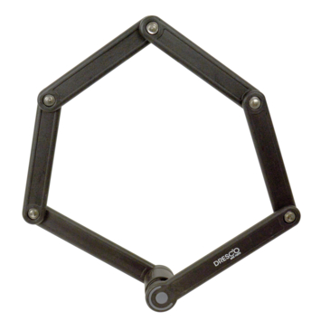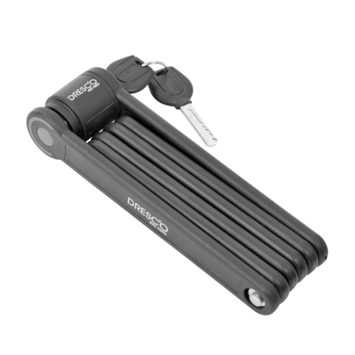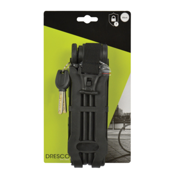 Het Dresco vouwslot met sleutel is een uniek compact slot door zijn scharnierconstructie. Het slot heeft een lengte van 85 centimeter en heeft 5,5 millimeter dikke geharde elementen. Het slot heeft zes elementen die met elkaar verbonden zijn, elk met een lengte van 19 cm. Daarnaast heeft het slot een praktische houder om het slot aan het frame, door middel van klittenband, te bevestigen en te vervoeren. Of monteer, indien aanwezig, de houder met de meegeleverde bouten in de bidonbevestiging in het frame. Het slot wordt geleverd inclusief twee veiligheidssleutels.