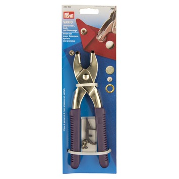 De drukknopentang is een tang geschikt voor drukknopen en om perforaties mee te maken. Met deze vario tang bevestig je eenvoudig alle Prym drukknopen, jeansknopen en ringen. De tang wordt standaard met 2 ponsmatrijzen van 3 en 4 millimeter geleverd.