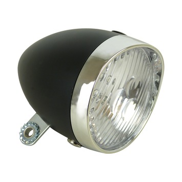 Houdt u van de retro look? Met deze LED koplamp geeft u uw fiets een elegante en klassieke uitstraling. Het voorlicht Classic is een zwart voorlicht met een chroom accent, in het bijzonder geschikt voor stadsfietsen en omafietsen. De lamp heeft zowel een continue als een knipperlicht functie. Inclusief 3 AAA/LR03 batterijen. Kleur: zwart.