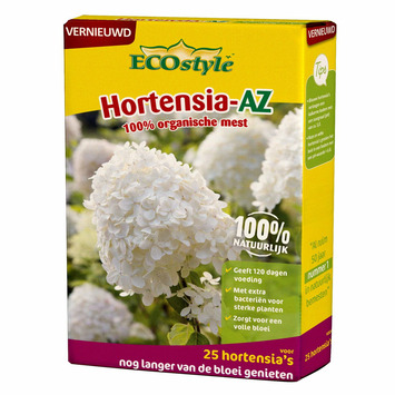 Deze mest is speciaal ontwikkeld voor hortensia's en is een volledig organische meststof. Doordat de Ecostyle Hortensia-AZ Mest bestaat uit een unieke mix van bacteriën, schimmels en protozoa zorgt het voor een gezonde bodem met voldoende voedingsstoffen zodat de hortensia's kleurrijk kunnen bloeien. Deze mest geeft 120 dagen voeding aan zomerplanten. 800 gram aan mest is voldoende voor 25 planten.