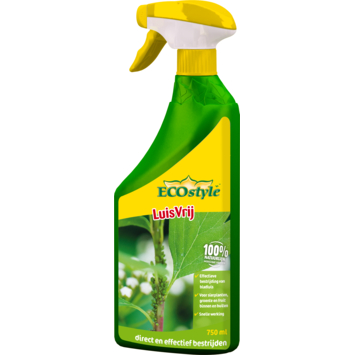 Heb je last van luizen op de bladeren van je planten? Bestrijd deze dan nu met Ecostyle luisvrij 750 ml. Dit product is gemaakt op basis van 100% natuurlijke stoffen en daarom vriendelijk voor het milieu. Bovendien kun je het zowel binnen als buiten inzetten. De werkzame stof is kaliumzout van vetzuur, een zeepachtige stof en onschadelijk is voor het bodemleven. Aangezien Luisvrij een contactmiddel is, is het belangrijk dat je alle insecten goed raakt. Zodra het volledige blad vochtig is, worden luizen en andere zogenoemde zachte insecten binnen korte tijd uitgeschakeld. Kortom: voor luisvrije en gezonde planten.