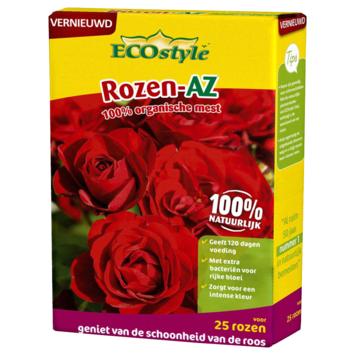 Deze mest is speciaal ontwikkeld voor rozenstruiken en is een volledig organische meststof. Doordat de Ecostyle Rozen-AZ Mest bestaat uit een unieke mix van bacteriën, schimmels en protozoa zorgt het voor een gezonde bodem met voldoende voedingsstoffen zodat de rozen kleurrijk kunnen bloeien. Deze mest geeft 120 dagen voeding aan zomerplanten. 800 gram aan mest is voldoende voor 25 rozenstruiken.