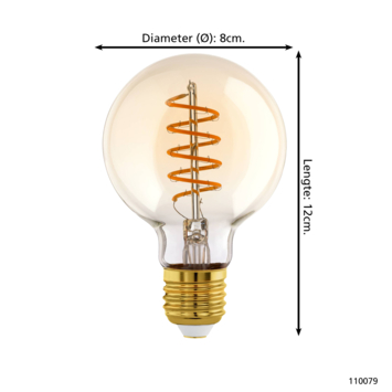De EGLO LED lichtbron Amber voor gebruik in diverse armaturen is 8 cm. De lichtbron is dimbaar en is een decoratieve lamp die gezien mag worden. De lichtbron van goudkleurig glas en de spiraalvormige draad past in bijna elke interieurstijl. Door de grote fitting (E27) past deze lamp in de meeste armaturen. Het wattage van deze globe is 4 Watt, en de lichtopbrengst is 245 lumen. De kleurtemperatuur is met 2000K warm te noemen.