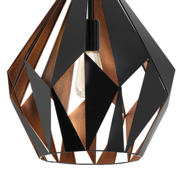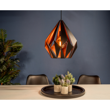 De Eglo hanglamp Carlton is speciaal ontworpen voor gebruik met een E27 lichtbron. Vervaardigd uit metaal, combineert deze hanglamp koper- en zwartkleurige elementen. De lamp bestaat uit één verstelbaar lichtpunt, die je op verschillende lengtes naar eigen voorkeur kunt instellen. De hanglamp heeft een diameter van 38,5 cm. De lampenkap heeft een druppelvorm en bevat openingen op bepaalde plekken. Aangezien de lichtbron niet is inbegrepen, heb je de vrijheid om zelf een dimbare lichtbron te kiezen. Deze lichtbron kan vervolgens gedimd worden met behulp van een externe dimmer.