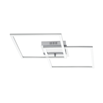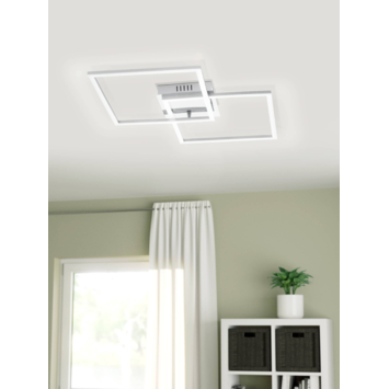 De plafondlamp PALMAVES 1 CCT-LED van metaal in staallook heeft twee grote vierkante verlichtingselementen. De achter de witte plastic kapjes geïntegreerde LED's kunnen met de meegeleverde afstandsbediening eenvoudig van functioneel wit licht aangepast worden naar aangenaam warm wit licht. Ook kun je deze plafondlamp dimmen of op een timer zetten via deze afstandsbediening. Dankzij het minimalistische ontwerp biedt deze plafondlamp moderne verlichting in elke ruimte, of het nu gaat om een keuken, woonkamer, slaapkamer, hal of eetkamer.
