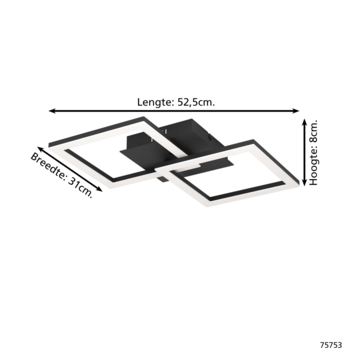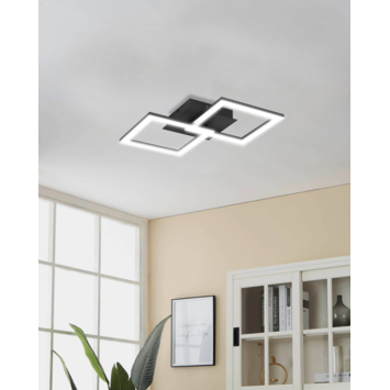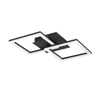 De plafondlamp RGBIC-LED van zwart metaal heeft twee vierkante verlichtingselementen. Met de meegeleverde afstandsbediening kunnen eenvoudig alle functies van deze plafondlamp bediend worden. De achter de witte plastic kapjes geïntegreerde LED’s kunnen aangenaam warmwit licht geven maar ook elke gewenste kleur, kleurcombinatie of zelfs van kleur wisselen op het geluid van bijv. muziek. Ook dimmen behoort tot de mogelijkheden met deze afstandsbediening. Dankzij het minimalistische ontwerp biedt deze plafondlamp moderne verlichting in elke ruimte, of het nu gaat om een keuken, woonkamer, slaapkamer, hal of eetkamer.