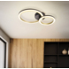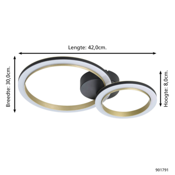 De Eglo plafondlamp Calliera LED van zwart metaal met messingkleurige accenten heeft twee ronde verlichtingselementen van verschillende grootte. De achter de witte kunststof kapjes geïntegreerde LED's geven een aangenaam warm wit licht. Dankzij het minimalistische ontwerp biedt deze plafondlamp moderne verlichting in elke ruimte, of het nu gaat om een keuken, woonkamer, slaapkamer, hal of eetkamer.