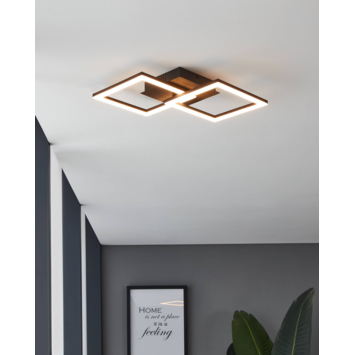 De plafondlamp PARANDAY ZIGBEE CONNECT CCT-LED van zwart metaal heeft twee grote vierkante verlichtingselementen waarvan er 1 draaibaar is. De achter de witte plastic kapjes geïntegreerde LED's kunnen via een gratis app of met een optionele afstandsbediening eenvoudig van functioneel wit licht aangepast worden naar aangenaam warm wit licht. Ook kun je deze plafondlamp dimmen of programmeren via de App. Daarnaast is deze lamp bedienbaar via de bekende Voice control devices (Alexa, Google assistent). Dankzij het minimalistische ontwerp biedt deze plafondlamp moderne verlichting in elke ruimte, of het nu gaat om een keuken, woonkamer, slaapkamer, hal of eetkamer.