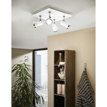 De Eglo quatrospot Tamara LED wit beschikt over 4 spots met LEDS van elk 33 watt met een lichtopbrengst van 240 lumen. Hierdoor vormt deze lamp een goede basisverlichting. Vanwege de IP44-beschermingsklasse is de lamp geschikt voor in de badkamer. De witte opbouwspot met chroom afwerking is een stijlvolle lichtbron voor in ieder modern woonvertrek. De 4 spots zijn individueel verstelbaar waardoor u het licht precies kunt draaien naar de plek waar u deze nodig heeft. Kortom, de Eglo quatrospot Tamara LED wit is een goede keuze voor in elk interieur.