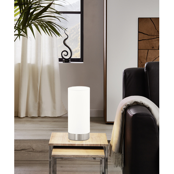 De Eglo tafellamp Pasteri touch wit is geschikt voor een lichtbron met een maximaal wattage van 40 watt met een standaard E27 lampfitting. Door het plaatsten van een energiezuinige LED-lichtbron verbruikt u minder energie dan met een gewone gloeilamp of spaarlamp. De voet van de lamp is gemaakt van staal en afgewerkt in de kleur nikkel-mat. Dit geeft de tafellamp een strakke uitstraling. De stoffen kap is wit en laat een mooi diffuus licht door. Hierdoor is de Eglo tafellamp Pasteri touch wit een mooie sfeerverlichting voor in elk modern interieur.