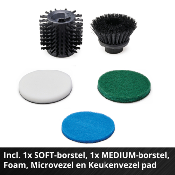 De Einhell accu-oppervlakborstel PICOBELLA 18/90 is een multifunctioneel hulpmiddel voor de reiniging binnen- en buitenshuis, zoals in de tuin, de garage of in het huishouden. Als onderdeel van het onderling grenzeloos combineerbare Power X-Change accusysteem kan elke accu van het systeem met de kabelloze reinigingsborstel worden gecombineerd. Deze is met een 2-traps toerentalinstelling uitgerust om afgestemd op het materiaal en de toepassing te kunnen werken. De machine is met een accuafdekking met afdichtingsring volgens waterbeschermingsklasse IPX4 uitgerust, zodat een natte reiniging mogelijk is. Daardoor wordt de Power X-Change accu optimaal tegen spatwater beschermd. Ook de geplaatste borstel kan worden voorzien van een afneembare spatbeschermingsafdekking met rubberlip. Zo ben je tijdens de reiniging met de roterende borstel beschermd tegen rondspattend water en vuil. De softgripoppervlakken zorgen voor comfortabel werken zonder wegglijden. Er zijn twee borstelkoppen inbegrepen: 1x borstel MEDIUM 90/20 voor het reinigen van robuuste oppervlakken, zoals tegels, steen of beton, en 1x borstel SOFT 120/50 voor het behoedzaam maar doeltreffend reinigen van verschillende oppervlakken, bijvoorbeeld vensterbanken, tuinmeubels of autovelgen. Bovendien zijn er drie verschillende reinigingspads inbegrepen, zoals 1x witte melamine schuimstofpad als vuilsnijder zonder extra reinigingsmiddel voor gladde oppervlakken, zoals glas, deuren/wanden en leder, 1x blauwe microvezelpad voor gevoelige oppervlakken, zoals kunststof, glas of metaal, en 1x groene keukenvezelpad voor het verwijderen van grof vuil, roest of kalk van robuuste oppervlakken, zoals gehard glas en gietijzer. De pads kunnen met behulp van de inbegrepen padhouders aan de reinigingsborstel worden bevestigd. Borstels en pads wissel je zonder gereedschap via een snel- of klittenbandsluiting. Met de meegeleverde wandhouder berg je de accu-oppervlakborstel eenvoudig op. Accu en oplader niet inbegrepen bij levering. Deze zijn apart verkrijgbaar.