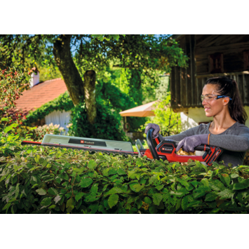 De Einhell Professional accu Heggenschaar GP-CH 18/61 Li BL Solo combineert vermogen en flexibiliteit: Als onderdeel van de Einhell Power X-Change productlijn maakt de heggenschaar gebruik van een krachtige en duurzame li-ion accu. De heggenschaar wordt aangedreven door een Einhell PurePOWER Brushless Motor. Deze koolborstelloze motor biedt meer vermogen en een langere levensduur dan conventionele koolborstelmotoren. Na online registratie geldt er 10 jaar garantie op de Brushless motor. Dankzij het lage gewicht van 2,9 kg ligt de handzame heggenschaar comfortabel in de hand. De roterende achterste handgreep en de smalle handgreep aan de voorzijde maken nauwkeurig vormgeven en snoeien mogelijk. De duurzame metalen tandwielaandrijving zorgt voor een optimale overbrenging van het vermogen naar de nauwkeurige lasergesneden en diamantgeslepen stalen messen met een snoeilengte van 61 cm en een tandafstand van 26 mm. De zwaardlengte is 67 cm. Hierdoor kunnen zelfs middelgrote tot grote hagen optimaal worden gesnoeid. Voor nog betere snoeiresultaten is een snelheidsregeling met twee standen beschikbaar: De ECO-modus zorgt voor een lange gebruiksduur, terwijl de MAX POWER-modus zorgt voor een optimale snoeisnelheid, zodat zelfs dikke takken eenvoudig kunnen worden gesnoeid. Het anti-blokkeersysteem zorgt voor optimale veiligheid tijdens de werkzaamheden De demonteerbare snoeiselverzamelaar maakt het mogelijk het snoeisel snel te verwijderen. Om de messen te beschermen, is een stabiele opbergkoker bij levering inbegrepen Samen met de stootbescherming is veiligheid tijdens transport en opslag gegarandeerd. De Accu Heggenschaar wordt geleverd zonder accu en zonder lader. Deze zijn apart verkrijgbaar.