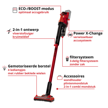 - ECO- en BOOST modus voor aanpassing van zuigvermogen, te gebruiken als kruimeldief of steelstofzuiger voor vloeren.