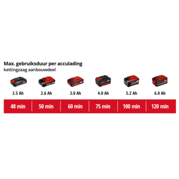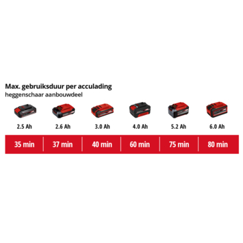 De Einhell Accu Tuin-Multitool GE-HC 18 Li T Solo is een krachtige en handige machine, die geschikt is voor uiteenlopende werkzaamheden. Doordat de machine op accu werkt, biedt de multitool een grote mate van flexibiliteit. Gebruik de zaag bijvoorbeeld bij het snoeien van hoge takken vanaf de grond, wat ideaal is bij hoge bomen of struiken. De machine is onderdeel van de Power-X-Change productlijn. Het kopstuk van de zaag is over een hoek van 90° te draaien, voor het moeiteloos produceren van horizontale sneden. Ook de motorkop van deze machine is kantelbaar in zeven standen, voor een grote mate van flexibiliteit. De aluminium telescoopsteel van deze multifunctionele zaag is traploos verstelbaar van 880 tot 1820 mm, zodat deze aansluit bij de lengte van je lichaam. Dit maakt het werken met de multifunctionele zaag een stuk comfortabeler. Naast de telescoopsteel wordt een extra handvat met snelsluiting met de zaag meegeleverd, voor nog meer controle. Het handvat blijft door de snelsluiting op z’n plek zitten. Daarbij is het handvat in vier verschillende standen verstelbaar. De multifunctionele zaag heeft een geïntegreerde olietank, wat zorgt voor een automatische kettingsmering. Mocht de ketting na verloop van tijd toe zijn aan vervanging, dan is het deze heel eenvoudig en zonder gebruik te maken van gereedschap te vervangen. Met de meegeleverde kettingspanner kun je de ketting weer strak zetten. Het kwaliteitszwaard en ketting zijn van het merk OREGON, wat de garantie biedt voor een hoge kwaliteit. Daarbij zijn de messen van de heggenschaar gemaakt van lasergesneden en diamantgeslepen staal voor optimale snoeiresultaten. De heggenschaar behaalt een snijresultaat van 1700 sneden per minuut. De snijlengte is 400 mm, zwaardlengte is 450 mm en de tandafstand is 16 mm. De maximale snijdikte is 12 mm. De kettingzaag heeft een zwaardlengte van 200 mm en een zaaglengte van 170 mm. De machine haalt een zaagsnelheid van 3,76 m/s. Deze Accu Tuin-Multitool werkt op een krachtige 18 V oplaadbare accu uit de Power-X-Change productlijn. Deze accu heeft drie handige LED’s, die je een indicatie van de vulstand van de accu geven. De accu is in verschillende mAh verkrijgbaar. De accu zit niet bij de machine inbegrepen. Heb je al gereedschap van de Power-X-Change-productlijn, dan kun je dezelfde accu’s en lader gebruiken voor deze Accu Tuin-Multitool. Door de technische mogelijkheden van nu met lithium-ion accu’s heeft ook Einhell een complete productlijn ontwikkelt waarbij de accu’s onderling uitwisselbaar zijn. Binnen deze Power-X-Change productlijn kunt u dus één en dezelfde accu in verschillende machines gebruiken. Bijvoorbeeld met de accu van de schroefmachine even snel de graskantjes trimmen, zelfs het opladen van USB producten, alles is mogelijk. U kunt vrijwel alle artikelen uit de Power-X-Change productlijn ook als “KIT” versie (inclusief accu & lader) aanschaffen. Als u reeds een Power-X-Change accu heeft zorgt dit er dus voor dat u veel geld kunt besparen. Doordat Einhell zelf een intelligent accu systeem heeft ontwikkeld, kunt u ook met toekomstige Einhell machines uw bestaande accu’s blijven gebruiken. Dit scheelt u geld in uw portemonnee. Het opladen van de accu voor deze Accu Tuin-Multitool verloopt snel, met de Einhell Power-X-Change 18 V snellader. De lader zit niet bij de machine inbegrepen..