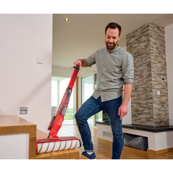 De Einhell accu-reiniger voor harde vloeren CLEANEXXO is als vervanging van de zwabber een ijverige hulp bij de schoonmaak thuis en dus de perfecte aanvulling op de stofzuiger. Als onderdeel van de Power X-Change productlijn kun je de reiniger voor harde vloeren met alle accu's en opladers van de productlijn combineren. Dankzij het wisselaccusysteem biedt de reiniger een onbeperkte, snoerloze looptijd: als een accu leeg is, kun je eenvoudig de volgende plaatsen en doorgaan met dweilen. De watertoevoer respectievelijk waterhoeveelheid van de reiniger voor harde vloeren regel je direct aan de handgreep, met behulp van een trigger. In combinatie met de standaard- en BOOST-modus, die de rotatiesnelheid van de wals beïnvloeden, verwijdert de reiniger zowel normaal vuil en stof als hardnekkige vlekken. In de BOOST-modus verhoog je bovendien het watervolume door de trigger in te drukken. Als er geen water wordt toegevoerd, kan de wals de vochtigheid van de vloer ook alleen opnemen en zo de vloer drogen. Door uit de schoonwatertank van 400 ml water toe te voeren, wordt de borstel voor het reinigen van de vloer bevochtigd. Het water wordt door een speciaal mechanisme weer opgenomen en in de vuilwatertank (300 ml) verzameld. Beide tanks kun je voor het vullen of leegmaken en reinigen compleet uit de machine nemen. Dankzij zijn slanke design en de opklapbare accuhouder bereik je met de accu-reiniger voor harde vloeren ook probleemloos hoeken, randen en vernauwingen. De reiniger is prettig in gebruik dankzij de ergonomische greep met softgrip en Always-on-functie. De CLEANEXXO berg je optimaal op in het parkeer-/reinigingsstation. Dankzij de automatische stafunctie staat deze dan rechtop. Via de zelfreinigende functie en speciale reinigingsribben op de bodem van het parkeerstation wordt de borstelwals gereinigd, wanneer je de BOOST-schakelaar gedurende 3 seconden ingedrukt houdt. Met behulp van de meegeleverde cleaning tools kun je bovendien het mondstuk reinigen of bijvoorbeeld haren uit de wals verwijderen. Dankzij de geïntegreerde draaggreep kun je de reiniger voor harde vloeren samen met het reinigingsstation eenvoudig transporteren. De borstelwals is geschikt voor het reinigen van diverse vloeren, zoals parket, laminaat, pvc, kurk linoleum, of ook grovere oppervlakken, zoals stenen vloeren en tegels. Je kunt de borstelwals zonder gereedschap verwisselen en in de machine wassen. Een reservewals is als apart accessoire verkrijgbaar. De accu-reiniger voor harde vloeren CLEANEXXO wordt zonder accu en oplader geleverd.