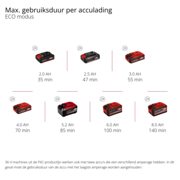 De Einhell accu tuinpomp AQUINNA 36/30 haalt water uit regenbakken of putten om je tuin mee te beregenen. Deze pomp bespaart water en hoort bij de Power X-Change serie. Hij werkt op twee 18V accu’s uit deze lijn. Met de ECO-schakelaar stel je in op zuinig of vol vermogen. De pomp levert maximaal 3000 liter per uur, met een opvoerhoogte van 26 meter en een aanzuighoogte tot 8 meter. De aansluitingen zijn 42 mm (1¼”) buitendraad en 33,3 mm (1”) binnendraad. Je kunt de pomp vullen en legen via speciale schroeven, waardoor vorstschade voorkomt. De motor heeft een overbelastingsbeveiliging. Dankzij de draaghandgreep neem je hem gemakkelijk mee. Geleverd zonder accu en oplader.