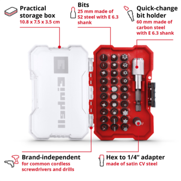 De Einhell bitset in XS-CASE biedt ideale basisuitrusting voor talrijke projecten en is compatibel met alle gangbare boorkoppen en bithouders in commercieel verkrijgbare accuschroevendraaiers en boren. Het bitset bevat 30 bits van 25 mm met C 6.3 schachten, die gemarkeerd zijn met een rode gekleurde ring. Onder deze bits bevinden zich de volgende aandrijfbits: PH1 / PH2 / PH2 / PH3 / PZ1 / PZ2 / PZ2 / PZ3 / SL3 / SL4 / SL5 / SL6 / H3 / H4 / H5 / H6 / T10 / T15 / T20 / T25 / T27 / T30 / T40 / TT10 / TT15 / TT20 / TT25 / TT27 / TT30 / TT40. De bits van het Einhell set zijn gemaakt van grijs gestraald S2 staal, dat bekend staat om zijn hoge duurzaamheid en prestaties. Ook inbegrepen in het bitset is een 60 mm lange snelwissel bithouder, die snelle en gemakkelijke wissels van bits mogelijk maakt dankzij de sterke magneet. De E 6.3 schacht van de bithouder is gemaakt van duurzaam koolstofstaal. Een ander centraal onderdeel van de Einhell-case is de adapter van hex naar 1/4" aandrijving, gemaakt van robuust, satijngefinishd CV staal. De praktische opbergdoos in Einhell ontwerp overtuigt door de goed georganiseerde opbergruimte. Dankzij de robuuste auto-lock sluiting blijft de gereedschapsset veilig op zijn plaats. Het transparante deksel biedt een optimaal overzicht van de afzonderlijke onderdelen, zodat de inhoud in één oogopslag kan worden geïdentificeerd zonder de doos te openen. De compacte maar krachtige XS-CASE biedt een eersteklas selectie gereedschappen waarmee verschillende projecten kunnen worden gerealiseerd. Deze veelzijdigheid maakt het een onmisbare bitset voor talrijke toepassingen in huis, tuin en werkplaats.