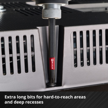 De Einhell 38-delige slag / impact- bitset in M-CASE biedt een uitgebreide selectie van hoogwaardige slagbitjes die geschikt zijn voor nauwkeurig en veeleisend schroefwerk. De slagbitset bevat acht slagvaste bitjes van 25 mm lengte met een C 6.3 schacht en PH1/ PH2 / PZ2 / PZ3 / T20 / T25 / SL4.5 / SL5.5 aandrijvingen en 18 slagvaste 50 mm lange bitjes met een E 6.3 schacht in de aandrijvingen PH1 / 2x PH2 / PH3 / PZ1 / PZ2 / PZ3 / T10 / T15 / T20 / T25 / T30 / T40 / SL5.5 / SL6.5 / H3 / H4 / H5. Bijzonder opmerkelijk zijn de acht extra lange 90 mm bitjes met PH2 / PZ2 / T10 / T15 / T20 / T25 / T30 / SL5.5 aandrijvingen. Alle slagbitjes zijn gemaakt van robuust, mangaan-gefosfateerd S2 staal en bieden een lange levensduur en duurzaamheid. De mangaan-gefosfateerde coating biedt extra corrosiebescherming en vermindert de wrijving bij het doordringen van het schroefmateriaal. De bitset bevat ook drie slagvaste zeskantige doppen met een E 6.3 schacht in de maten 7 / 8 / 10 mm. Deze magnetische doppen zijn gemaakt van duurzaam 50BV30 staal en kunnen de hoge koppel van slagloze schroefmachines weerstaan. De gereedschapsset wordt afgerond met een 60 mm lange slagvaste bithouder met een roestvrijstalen huls en E 6.3 koolstofstaal schacht. Dankzij de geïntegreerde, sterke magneet kan de roestvrijstalen huls het magnetisme direct naar het bit overbrengen, zodat de bits stevig op hun plaats worden gehouden en schroeven precies worden geleid. De Einhell set is universeel te gebruiken en compatibel met alle standaard boorkoppen en bithouders in commercieel verkrijgbare (slag) schroefmachines en boormachines. De afzonderlijke onderdelen worden opgeborgen in een robuuste kunststof opbergdoos. De praktische opbergdoos is voorzien van een robuuste auto-lock clipvergrendeling, die ervoor zorgt dat de doos stevig gesloten is. Het transparante deksel biedt een optimaal overzicht van de afzonderlijke onderdelen, zodat de juiste Einhell gereedschappen gemakkelijk geselecteerd kunnen worden. Bovendien bieden verwisselbare inzetstukken maximale flexibiliteit om de inhoud naar wens te organiseren. Dankzij de extra lange bitjes is de 38-delige slagbitset niet alleen geschikt voor standaard schroefwerk, maar ook voor diepe uithollingen of moeilijk bereikbare plaatsen.