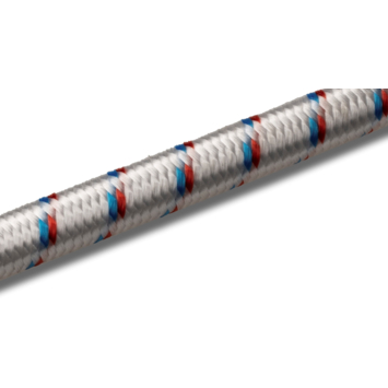 Elastiek, geproduceerd door Seilflechter is wit met en blauw/rode markering en heeft een diameter van 6mm met een lengte van 15mtr. De kern is vervaardigd van hoogwaardig latex met een polyester gevlochten mantel. Het elastiek is UV bestendig, heeft een rek van 130% en is gewikkeld op een herbruikbare haspel.