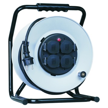 Vaste kern met 4 contactdozen. Bij op of afrollen raken kabels niet in de war. Zwaar model met beugel. Waterdichte contactdozen met kleppen. 40 meter 3 x 1,5mm² neopreen kabel.