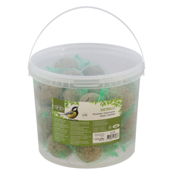 Emmer met vetbollen bestaande uit 30 stuks. Strooi de bollen uit in je tuin of leg ze op een voederplateau. De bollen bestaan uit havervlokken, zonneboempitten, pinda's en hoogwaardige vetten.