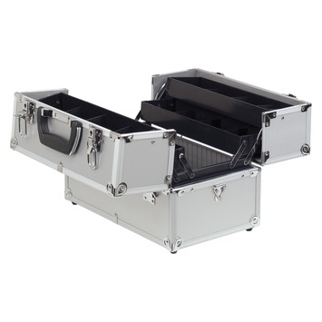 De Erro koffer aluminium uitklapbaar zilver is een handige opberg koffer. De zilveren koffer is perfect voor het bewaren van gereedschap. De uitklapbare koffer heeft 4 trays en kan daardoor veel bewaren. In totaal heeft het 5 vakken. Je hebt dan ook genoeg ruimte om je gereedschap te sorteren. De afgeronde hoeken zorgen dat de koffer lang mooi blijft. De gereedschapskoffer heeft een hoogte van 240 mm en een breedte van 360 mm. De handgreep op de koffer zorgt dat je hem gemakkelijk kan vervoeren.