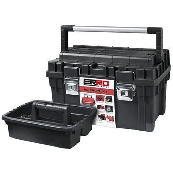 De gereedschapskoffer heeft een inzetbak voor klein gereedschap of onderdelen. Daarnaast heeft de gereedschapsbak ook een aluminium handreep en 2 stevige metalen sluitingen. Deze kunnen eventueel worden afgesloten door middel van hangsloten (niet meegeleverd). De deksel blijft hierdoor ook beter op zijn plek zitten. De koffer is gemaakt van kunststof en hierdoor ook zeer licht. Je kan de gereedschapskoffer dus eenvoudig meenemen naar je werkzaamheden. Kortom, de Erro 500 Gereedschapskoffer met inzet is zeer efficiënt en handig in gebruik.