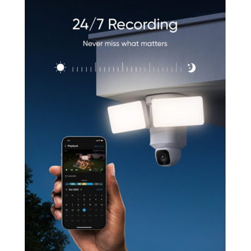 De Eufy E30 floodlight is IP65-weerbestendig en werkt op vaste stroom. Hierdoor blijft hij continu actief, ongeacht het weer. Je kunt beelden lokaal opslaan op een microSD-kaart tot 128 GB (niet inbegrepen) of koppelen met een HomeBase 3 (S380) voor meer opslagruimte. Let op: deze beveiligingscamera werkt zelfstandig, maar kan optioneel worden verbonden met de HomeBase 3 voor slimme functies. Zo heb je 24/7 bewaking zonder abonnementskosten.
