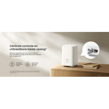 De beelden van de EufyCam E40 worden lokaal opgeslagen via de meegeleverde HomeBase 2. Zo betaal je geen maandelijkse kosten en blijven je opnames veilig bij jou thuis. De HomeBase heeft 16 GB interne opslag die je kunt uitbreiden tot 256 GB met een USB-stick (niet meegeleverd). **Let op:** deze beveiligingscamera werkt niet zonder de HomeBase. De set bevat een HomeBase 2, maar de camera is ook compatibel met de HomeBase 3 (S380). Dankzij de koppeling met de Eufy-app bekijk je beelden eenvoudig op je smartphone en bedien je de camera op afstand.