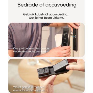 De Eufy Video Deurbell E340 is draadloos of bedraad aan te sluiten. Met deze slimme videodeurbel weet je altijd wie er voor de deur staat, zelfs al je niet thuis bent. Deze videodeurbel is voorzien van twee camera’s. De naar voren gerichte camera richt zich op mensen en de omlaag gerichte camera vult dit aan met zicht op de grond voor je voordeur. Hierdoor heb je geen blinde vlekken en altijd volledig zicht op wat er gebeurd bij de voordeur. Communiceren met bezoekers gaat gemakkelijk via de app. De deurbel neemt op in 2K en biedt hierdoor haarscherp beeld. Daarnaast heeft de deurbel goed nachtzicht waardoor je ook goed beeld hebt als de zon onder is. De oplaadbare batterij is gemakkelijk verwisselbaar als je een reservebatterij hebt en hoeft dan tijdens het opladen niet uit. De deurbel wordt geleverd inclusief slimme deurbelgong, die naast geluid maakt bij het aanbellen, ook de beelden lokaal opslaat. De Eufy videodeurbel werkt met Amazon Alexa en Google Assistant.
