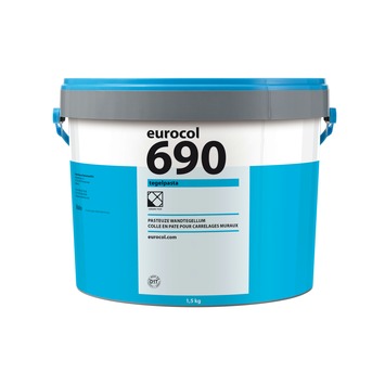 Eurocol 690 pasta tegellijm gebroken wit 1,5kg is een kant-en-klare pasta tegellijm die binnen toegepast kan worden. Je kunt deze tegellijm direct gebruiken voor het verlijmen van wandtegels, natuursteen (behalve marmer) en bouw- en isolatieplaten. De tegellijm is te gebruiken op nagenoeg alle wanden, zoals cement- en gipsgebonden ondergronden en bestaand tegelwerk. De Eurocol pasta tegellijm 690 is vochtbestendig en hierdoor zeer geschikt voor toepassing in natte ruimtes. Het verbruik van deze lijm is circa 1,3 kg per vierkante meter bij toepassing van normale wandtegels op vlakke ondergronden. De lijm wordt geleverd in een handige emmer van 1,5kg.