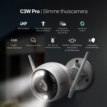 De C3W Pro, de geüpgradede nachtzichtcamera in kleur van EZVIZ, bevat een AI-algoritme voor persoonsdetectie en nauwkeurigere waarschuwingen, zelfs in het donker. U kunt ook tweerichtingsgesprekken voeren met uw familie of bezoekers met de EZVIZ-app op uw mobiele telefoon, waar u ook bent.