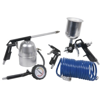 5 delige luchtset met verfspuit, bandenvulpomp, blaaspistool, vloeistofspuit en luchtslang.