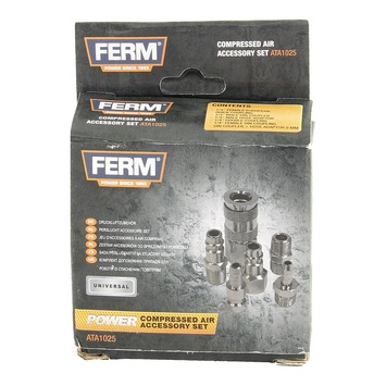 De FERM perslucht-accessoireset ATA1025 is geschikt voor alle compressoren en luchtgereedschappen. Deze set bestaat uit 6 stuks snelkoppelingen en nippels, te weten een DIN 1/4"man koppeling, DIN 1/4"vrouw koppeling, DIN koppeling met slangadapter 8mm, Slangadapter 1/4"man, Euro snelkoppeling 1/4"vrouw en Dubbele koppeling 1/4". Met deze koppelingen en nippels kunt u luchtgereedschappen op eenvoudige wijze koppelen aan de compressor. De jarenlange ervaring van FERM staat borg voor een uitstekende kwaliteit en jarenlang gebruiksgenot. Daarmee is de FERM perslucht-accessoireset ATA1025 een ideale aanvulling op uw compressor, waar u veel plezier van zult hebben.