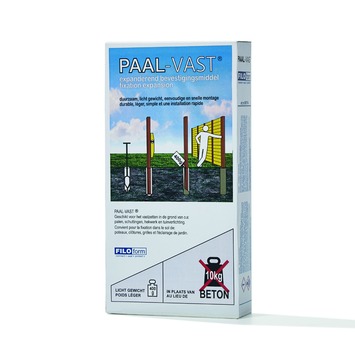 Een doosje (400 gram) Paal-vast is geschikt om één tuinpaal mee vast te zetten.