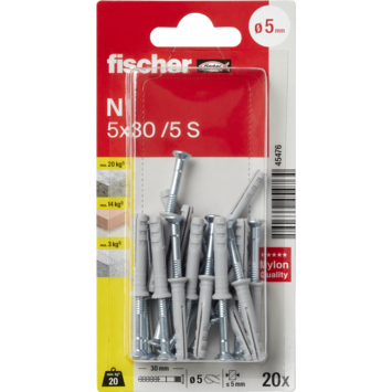 De Fischer N 5x30/5 S nagelpluggen zijn geschikt voor gebruik in verschillende soorten materialen zoals beton, wandverbinding en metaal. De nagelpluggen of slagpluggen zijn maximaal te belasten tot 16kg, afhankelijk van het materiaal. Gebruik voor het boren van het gat een boor met een diameter van 5mm. De plug is 30mm lang, de schroef heeft een lengte van 38mm en een diameter van 3,5mm. De nagelpluggen zijn zeer geschikt voor het monteren van houten regelwerk. Eén verpakking bevat 20 stuks pluggen.