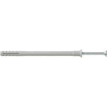 Deze Fischer-nagelplug N8x120X, verpakt per 50 stuks, gebruikt u voor het monteren van houten regelwerk op verschillende materialen. Denk aan betonnen wanden, wandverbindingen en metalen profielen. Gebruik voor het boren van het gat waarin u de nagelplug aanbrengt, een boor met een diameter van 8mm. De 120mm lange nagelplug brengt u aan en vervolgens de schroef van 125mm met een diameter van 5mm. Na montage is deze nagelplug met een lengte van 12cm, afhankelijk van het materiaal waarin u de plug bevestigt, te belasten tot maximaal 27kg. U koopt de Fischer-nagelplug N8x120X per 50 nagelpluggen.
